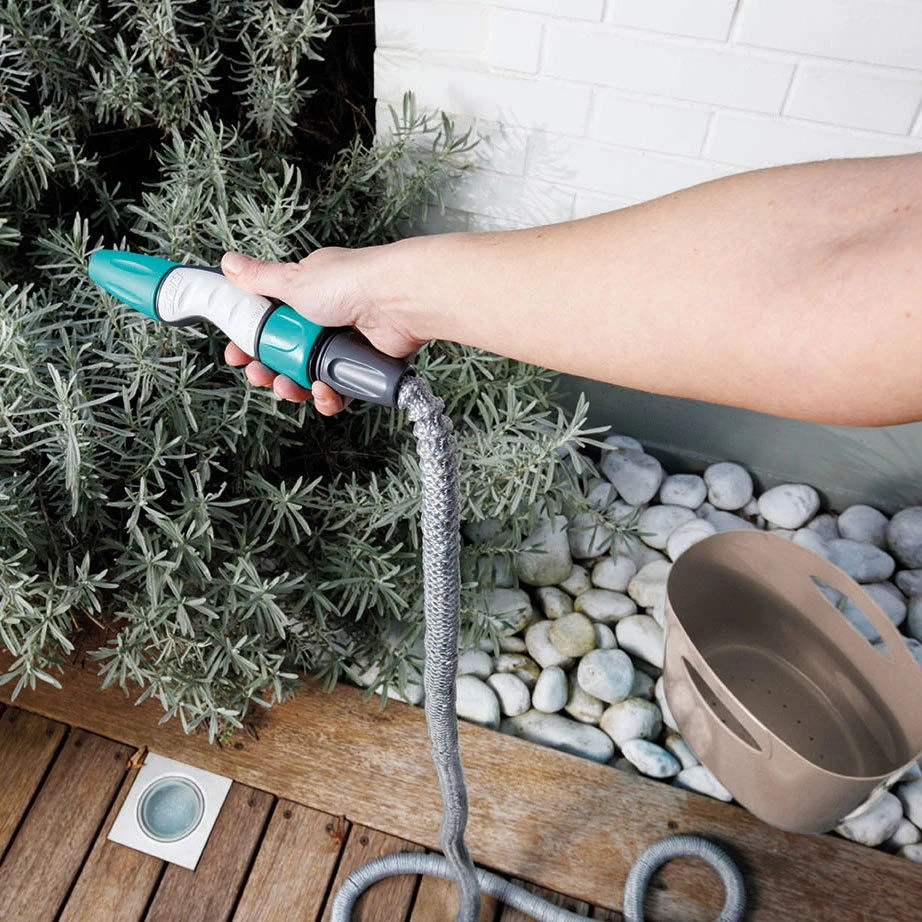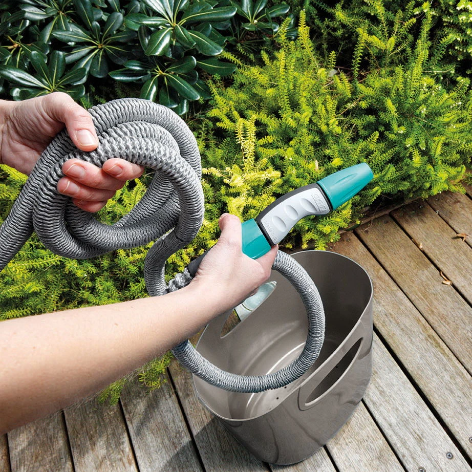 Dieser Gartenschlauch wird zum neuen Favoriten bei der Bewässerung. Der Grund: Während der Anwendung dehnt sich der eigentlich fünf Meter lange Schlauch auf bis zu 15 Meter aus. Anschließend entleert er sich und wird wieder kompakt. Er eignet sich aufgrund des geringen Eigengewichts für die Bewässerung kleiner Gärten, Balkone und Terrassen. Geliefert wird außerdem eine Tasche zum Verstauen.