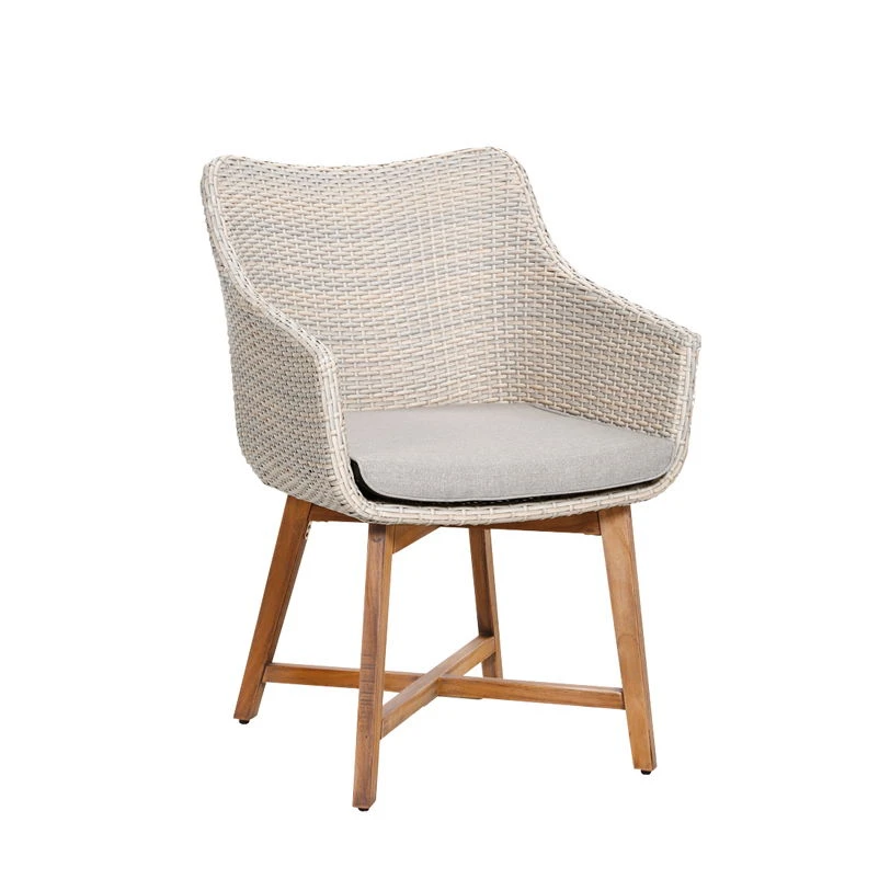 Klassisch-eleganter Korbsessel aus bequemem, strapazierfähigem Kunstgeflecht mit hochwertigen, witterungsbeständigen Teak-Holz-Beinen. Das gelungene Design verbindet die Moderne des changierenden, alabasterfarbenen Flechtgewebes mit dem Beständigen des erdigen Teak-Holzes.