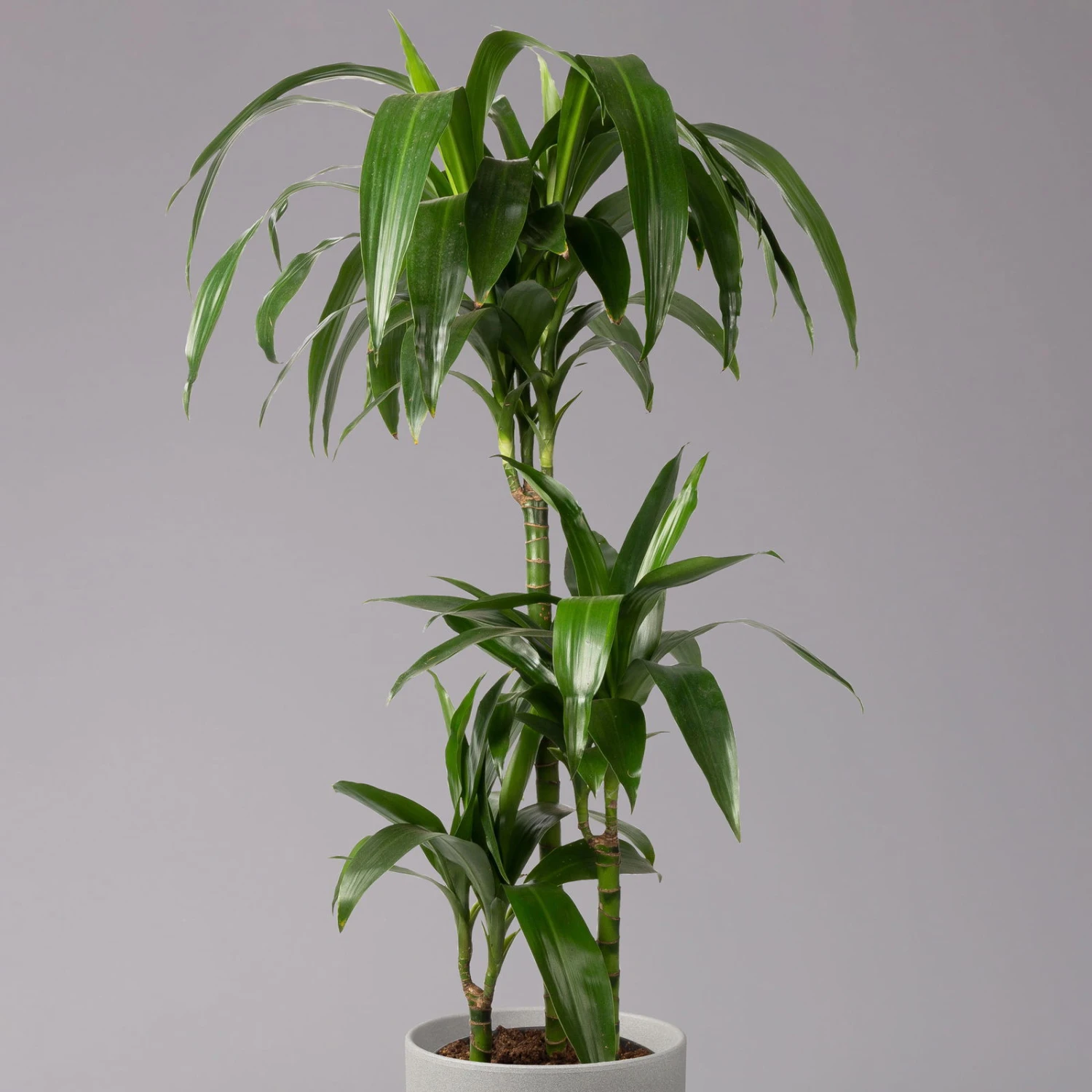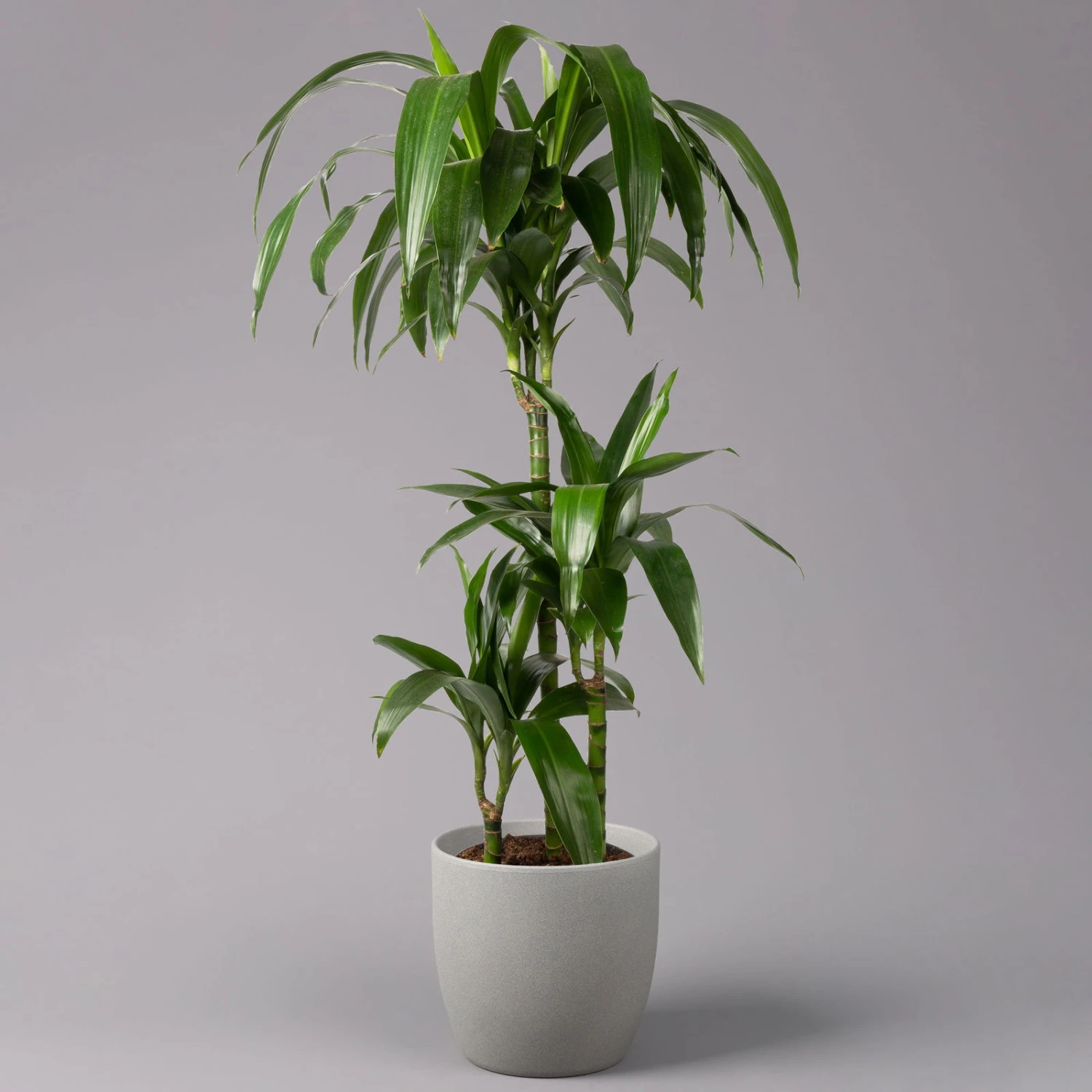 Die Drachenbaum ‚Janet Craig‘ ist eine elegante Drachenbaum-Züchtung mit vergleichsweise breiten, sattgrünen Blättern. Das Gewächs kann die Wuchshöhen bis zu 2 bis 3 Metern im Zimmer erzielen und benötigt einen hellen Standort ohne direkte Sonneneinstrahlung. Wir empfehlen Ihnen, Drachenbäume zu kaufen, um die Luftqualität in Ihrem Büro oder Arbeitszimmer zu verbessern. Unter anderem binden diese Ziergewächse Tonerstäube und Benzole. Gehen Sie beim Gießen besonders im Winter eher sparsam vor, denn Staunässe vertragen die Drachenbäume nicht. Das Substrat darf daher gerne etwas antrocknen.