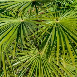 Die fächerförmigen Blätter der Hanfpalme (Trachycarpus fortunei) haben einen langen, festen Blattstiel und begeistern das ganze Jahr über mit satt grüner Farbe. Die Hanfpalme bildet einen Stamm an dessen oberer Spitze ein Blattschopf steht. Der aufrechte, gerade, unverzweigte Stamm ist mit Hanffasern eingehüllt. Die mediterrane Kübelpflanze kann am Naturstandort eine Wuchshöhe von bis zu 10 Metern erreichen. Im Kübel werden maximal 2 bis 4 Meter Höhe erlangt.