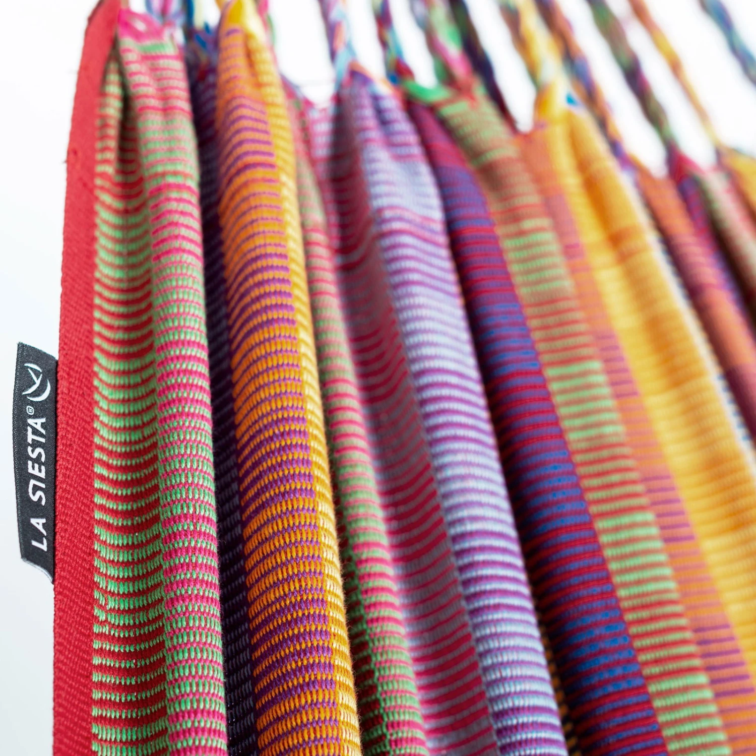 Wer das Gefühl der Schwerelosigkeit mag und gerne träumt, wird die Doppel Hängematte ‚Modesta‘ lieben. Sie besteht aus bunter Bio-Baumwolle, die lange Fasern hat und sehr reißfest ist. Mit den großzügigen Maßen 350 x 160 cm ist die Hängematte ideal für zwei Personen. Die maximale Belastbarkeit beträgt 160 kg.