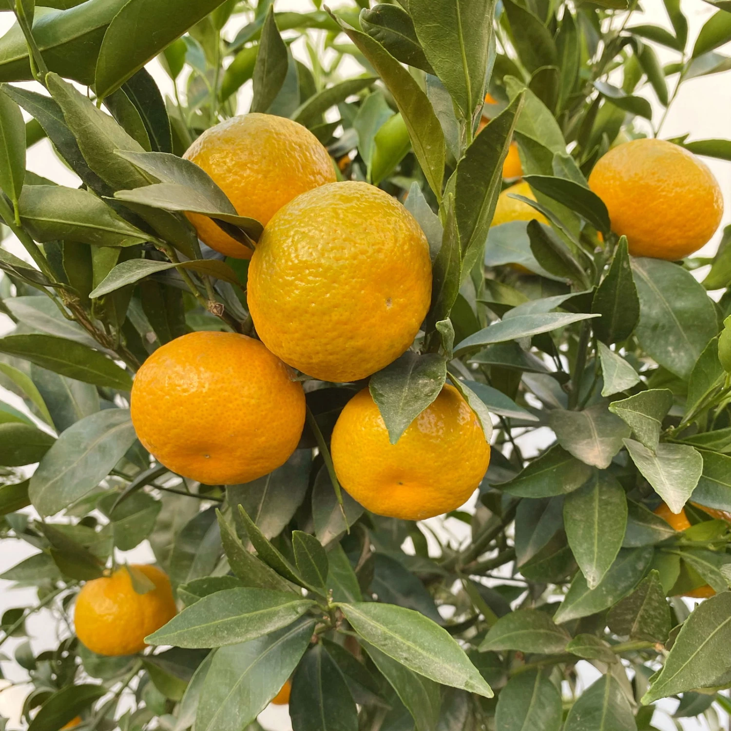Die länglich ovalen, vorne zugespitzten Blätter des Mandarinenbaumes (Citrus reticulata) begeistern das ganze Jahr über mit satt grüner Farbe. Das Mandarinenbäumchen wächst von Natur aus bei ausreichender Helligkeit kompakt und dicht buschig. Sollten es doch etwas locker wachsen, können Sie durch Rückschnitt die Verzweigung anregen und somit die Krone kompackter gestalten. Die mediterrane Kübelpflanze kann eine Wuchshöhe von 1,50 -2,50 Metern erreichen.