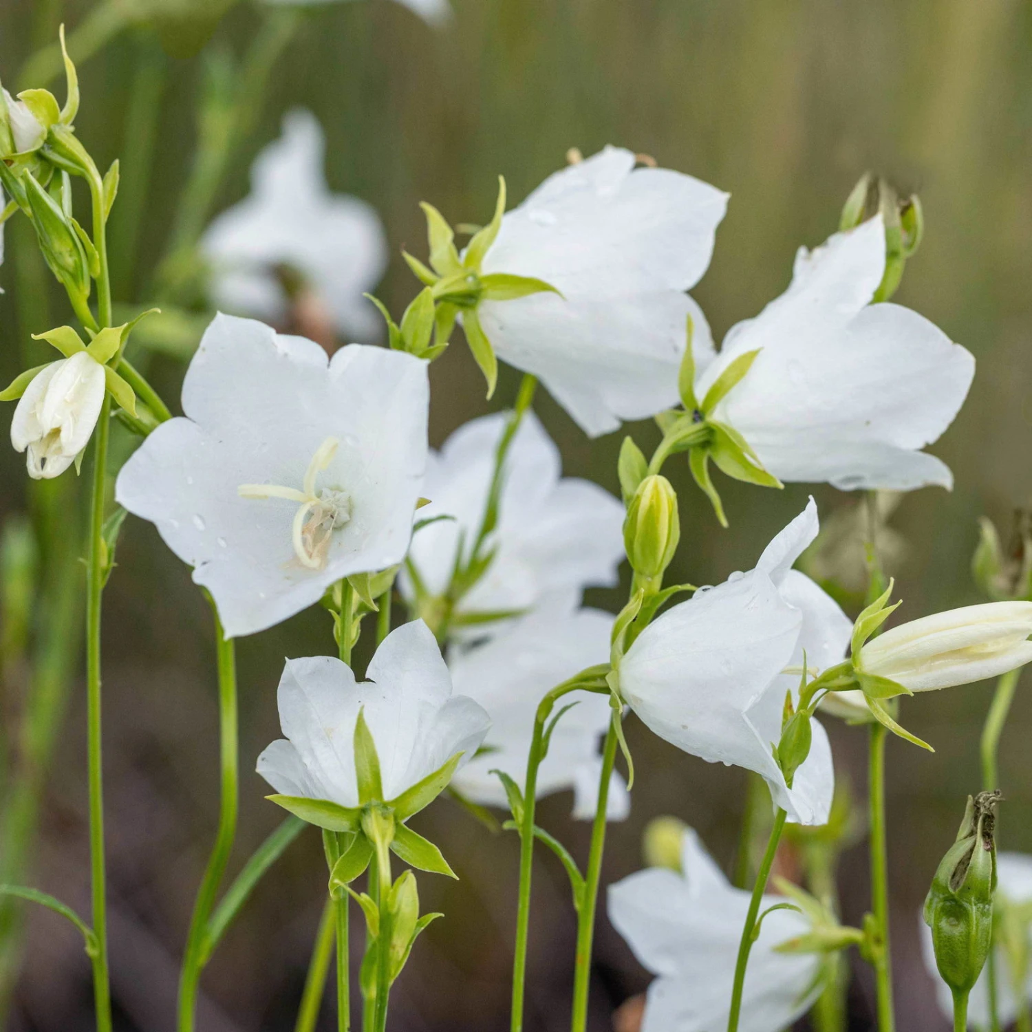 Die Pfirsichblättrige Glockenblume ‚Alba‘ bildet ihre strahlend weißen, glockenförmigen Blüten von Juni bis Juli. Regelmäßiges Entfernen der verblühten Triebe regt zu weiterer Knospenbildung an und kann die Blühzeit deutlich verlängern. Mit einer Wuchsöhe zwischen 60 und 80 cm überzeugt die aufrecht wachsende, ausläuferbildende Staude nicht nur in Gruppen gepflanzt im Garten, sondern eignet sich auch sehr gut als Rosenbegleiter oder als Bepflanzung von Pflanzkübeln. Die Bienenweide gilt als äußerst pflegeleicht, ist gut frostverträglich, wintergrün und samt sich am richtigen Standort zuverlässig selbst aus.